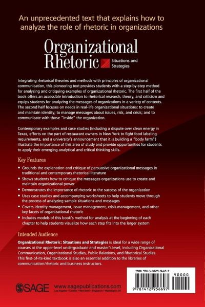 Organizational Rhetoric introduces students to a rhetorical approach to understanding, analyzing and creating organizational messages for both internal employees and external customers. This textbook provides students a theoretically-grounded understanding of the basic building blocks of organizational rhetoric, the types of rhetorical situations faced by organizational communicators, and the specific strategies used to address six common organizational rhetorical situations (such as image management). Students will gain an understanding of the power of organizations in contemporary society and be able to think critically about organizational messages. The text is organized in two units. In the first unit, authors Mary Hoffman and Debra Ford introduce the rationale for a rhetorical approach to organizational messages, and introduce the basic rhetorical building blocks and principles behind the rhetorical situation and the analysis of strategies. In the second unit, the authors cover six specific rhetorical situations commonly faced by organizations, image and identity management, issue management, impression management, risk management, crisis management and organizational apologia, and internal message management. Each chapter is structured similarly, in conjunction with the ideas developed in unit one, and each ends with a case study that exemplifies the content presented in that chapter. Features and Benefits: - The first unit in the text will introduce the details of analyzing situations and identifying strategies - The second unit will examine six specific recurring rhetorical situations for organizations - Organizational schema centered on situations and strategies - Use of real-life case studies - Focus on careers in organizational rhetoric - Focus on thinking critically about organizations in society