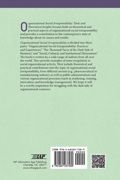 In the book Organizational Social Irresponsibility: tools and theoretical insights we focus both on theoretical and practical aspects of organizational social irresponsibility and hope to provide a contribution to the contemporary state of knowledge about its causes and results. The book is divided into three parts: first titled "Organizational Social Irresponsibility: Practices and experiences", second: "The thousand faces of dark side of business" and third: "Social, cultural and institutional dimensions". The book is written by a range of authors from all over the world. They provide us with examples of some irregularity in social organizational activity. There were included some theoretical and practical contributions into the topic of organizational social irresponsibility, from different sectors (e.g. pharmaceutical or manufacturing industry as well as public administration) and various organizational processes (such as marketing, training, innovation and knowledge management). We hope it will be a worthy inspiration for struggling with dark sides of organizational existence.