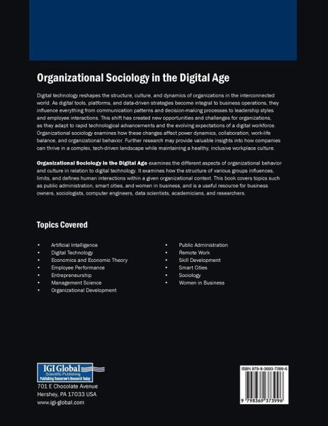 Digital technology reshapes the structure, culture, and dynamics of organizations in the interconnected world. As digital tools, platforms, and data-driven strategies become integral to business operations, they influence everything from communication patterns and decision-making processes to leadership styles and employee interactions. This shift has created new opportunities and challenges for organizations, as they adapt to rapid technological advancements and the evolving expectations of a digital workforce. Organizational sociology examines how these changes affect power dynamics, collaboration, work-life balance, and organizational behavior. Further research may provide valuable insights into how companies can thrive in a complex, tech-driven landscape while maintaining a healthy, inclusive workplace culture. Organizational Sociology in the Digital Age examines the different aspects of organizational behavior and culture in relation to digital technology. It examines how the structure of various groups influences, limits, and defines human interactions within a given organizational context. This book covers topics such as public administration, smart cities, and women in business, and is a useful resource for business owners, sociologists, computer engineers, data scientists, academicians, and researchers.