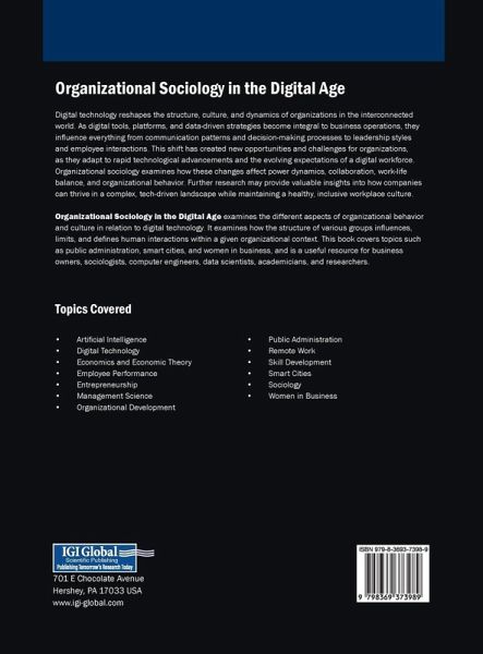 Digital technology reshapes the structure, culture, and dynamics of organizations in the interconnected world. As digital tools, platforms, and data-driven strategies become integral to business operations, they influence everything from communication patterns and decision-making processes to leadership styles and employee interactions. This shift has created new opportunities and challenges for organizations, as they adapt to rapid technological advancements and the evolving expectations of a digital workforce. Organizational sociology examines how these changes affect power dynamics, collaboration, work-life balance, and organizational behavior. Further research may provide valuable insights into how companies can thrive in a complex, tech-driven landscape while maintaining a healthy, inclusive workplace culture. Organizational Sociology in the Digital Age examines the different aspects of organizational behavior and culture in relation to digital technology. It examines how the structure of various groups influences, limits, and defines human interactions within a given organizational context. This book covers topics such as public administration, smart cities, and women in business, and is a useful resource for business owners, sociologists, computer engineers, data scientists, academicians, and researchers.