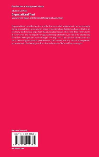 Organizations consider trust as a pillar for successful operations in an increasingly global competitive environment. Some professionals go further and argue that in an economy trust is more important than natural resources. This book deals with ways to measure trust and its impact on organizational performance, as well as to understand the role of Management Accounting in creating trust. The author demonstrates that trust drives organizational performance, and reveals the key role of management accountants in facilitating the flow of trust between CEOs and line managers.