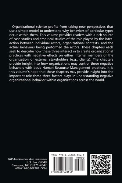 Organizational science profits from taking new perspectives that use a simple model to understand why behaviors of particular types occur within them. This volume provides readers with a rich source of case-studies and empirical studies of the role played by the interaction between individual actors, organizational contexts, and the actual behaviors being performed the actors. These chapters each seek to describe how these three interact in to create organizational practices with negative effects on either internal members of the organization or external stakeholders (e.g,. clients). The chapters provide insight into how organizations may control these negative behaviors with basic Human Resource Management practices. It is this volume's hope that these chapters may provide insight into the important role these three factors plays in understanding negative organizational behavior within organizations across the world.