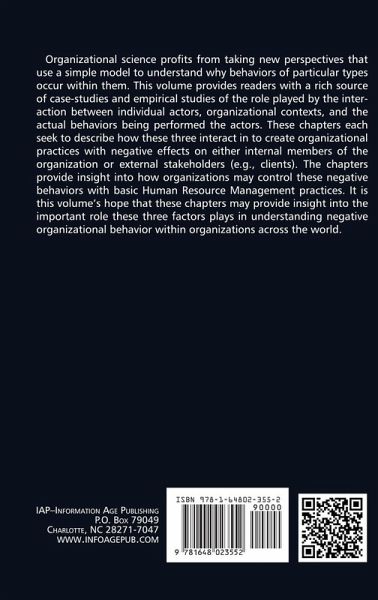 Organizational science profits from taking new perspectives that use a simple model to understand why behaviors of particular types occur within them. This volume provides readers with a rich source of case-studies and empirical studies of the role played by the interaction between individual actors, organizational contexts, and the actual behaviors being performed the actors. These chapters each seek to describe how these three interact in to create organizational practices with negative effects on either internal members of the organization or external stakeholders (e.g,. clients). The chapters provide insight into how organizations may control these negative behaviors with basic Human Resource Management practices. It is this volume's hope that these chapters may provide insight into the important role these three factors plays in understanding negative organizational behavior within organizations across the world.