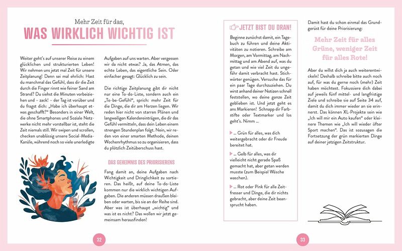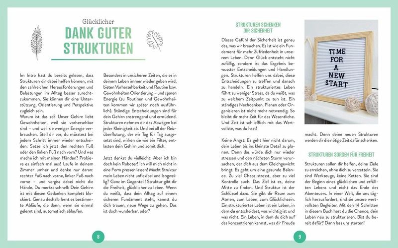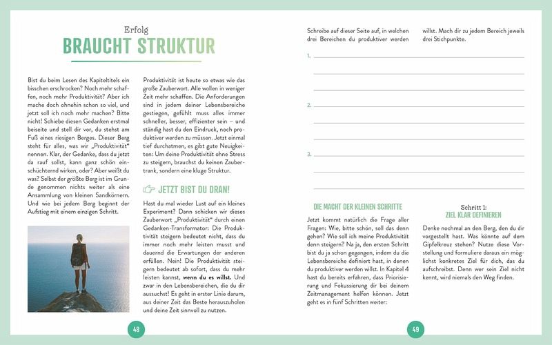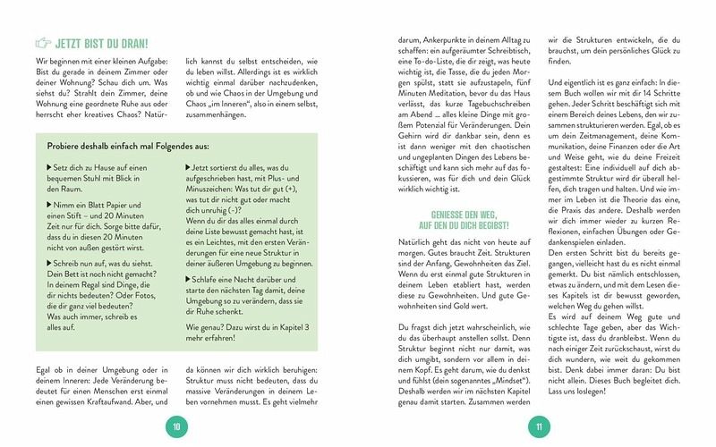 Ob in deinem Zuhause, in der digitalen Welt, in deiner täglichen Kommunikation, in deinen Beziehungen, in der Freizeit oder bei den Themen Self-Care, Gesundheit, Ernährung & Geld: Überall können dir Strukturen, Routinen und Gewohnheiten dabei helfen, deine Ziele leichter zu erreichen und ein produktiveres, glücklicheres Leben zu führen. Ausfüll- und Eintragmöglichkeiten im Buch unterstützen dich dabei, deine Ziele immer im Blick zu behalten und deinen neuen Weg motiviert weiterzugehen.