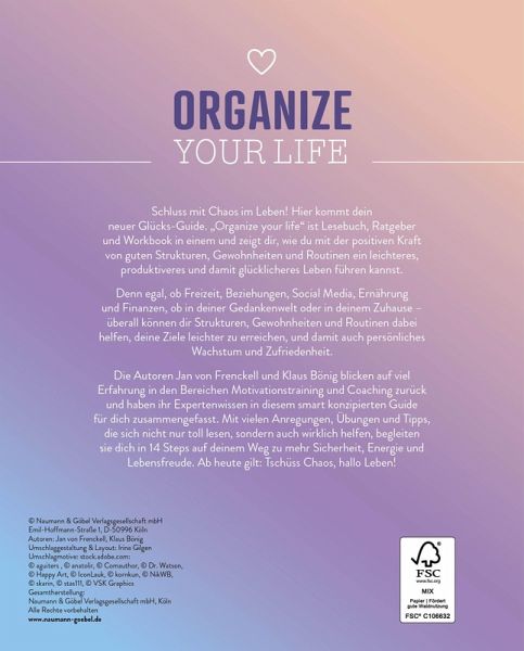 Organize your life ist Lesebuch, Ratgeber und Workbook in einem und ein unverzichtbarer Begleiter auf deinem Weg zu mehr Ordnung, Leichtigkeit und Lebensfreude! In 14 Steps erfährst du mithilfe von zahlreichen Tipps & Tricks, kleinen Aufgaben, Tests, Gedankenspielen und Checklisten, wie du in allen Bereichen deines Alltags geordnete Strukturen aufbaust sowie Routinen und gute Gewohnheiten entwickelst, die dir Sicherheit, Zuversicht, Energie und damit mehr Kraft und Glücksgefühl schenken.