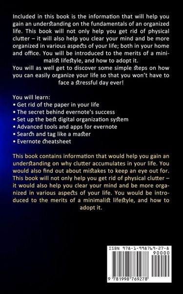 Included in this book is the information that will help you gain an understanding on the fundamentals of an organized life. This book will not only help you get rid of physical clutter - it will also help you clear your mind and be more organized in various aspects of your life; both in your home and office. You will be introduced to the merits of a minimalist lifestyle, and how to adopt it. You will as well get to discover some simple steps on how you can easily organize your life so that you won't have to face a stressful day ever! You will learn:Get rid of the paper in your life The secret behind evernote's success Set up the best digital organization system Advanced tools and apps for evernote Search and tag like a master Evernote cheatsheet This book contains information that would help you gain an understanding on why clutter accumulates in your life. You would also find out about mistakes to keep an eye out for. This book will not only help you get rid of physical clutter - it would also help you clear your mind and be more organized in various aspects of your life. You would be introduced to the merits of a minimalist lifestyle, and how to adopt it.