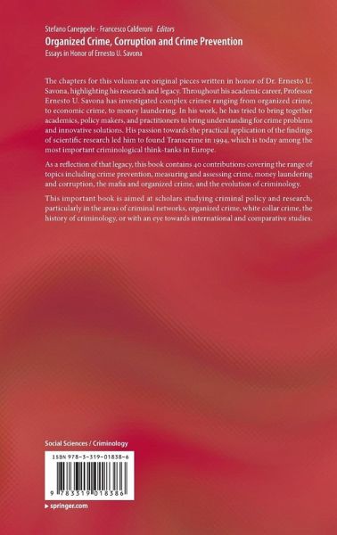 Integrity Plans and Prevention of Corruption.- Combatting Corruption.- Corporate Psychopatcs.- Political Corruption of International Criminal Justice.- Measuring Corruption.- Criminals, Beneficial Owners and the Use of Companies for Money Laundering.- Usury as an Evolving Concept.- Risk Assessment of Juvenile Delinquency.- Script Analysis and Situational Crime Prevention.- Some Difficulties with Crime Statistics.- Preventing Crime in the UAE.- Incentives and Crime Reduction.- Preventing Crime and Evoking Altruism.- Policing and the Problem of Trust.- Social Capital and Delinqency.- Understanding Long Term Crime Trends in Italy and Elsewhere.- Biology, Neurosciences and Criminology.- International Collaboration in Criminology.- Non Italian Mafias in Italy.- The Changing Face of Organized Crime.- Organized Crime and Small Arm Trafficking.- Organized Crime and the Internet.- Understanding Banking and the Role of Traditional Organized Crime.- Measuring Organized Crime Presence in Italy.- Choosing a Micro or Macro Perspective on Studying Organized Crime.- The Business of Terrorism.- Changing Patterns of Chinese Organized Crime in North America.- Tackling Organized Crime through Confiscation.- Measuring Violence Against Women Victimization Risk.- Misusing Social Indicators.- Using Self-Report Surveys to Measure Crime.- Old Crime and New Immigrant Crime.- Measuring Crime Against Businesses.- Patterns of Theft and Fraud by Employees in Switzerland.- Immigrants as Victims of Crime.- High-level Drug Trafficking.