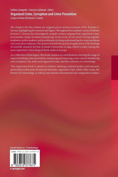 Integrity Plans and Prevention of Corruption.- Combatting Corruption.- Corporate Psychopatcs.- Political Corruption of International Criminal Justice.- Measuring Corruption.- Criminals, Beneficial Owners and the Use of Companies for Money Laundering.- Usury as an Evolving Concept.- Risk Assessment of Juvenile Delinquency.- Script Analysis and Situational Crime Prevention.- Some Difficulties with Crime Statistics.- Preventing Crime in the UAE.- Incentives and Crime Reduction.- Preventing Crime and Evoking Altruism.- Policing and the Problem of Trust.- Social Capital and Delinqency.- Understanding Long Term Crime Trends in Italy and Elsewhere.- Biology, Neurosciences and Criminology.- International Collaboration in Criminology.- Non Italian Mafias in Italy.- The Changing Face of Organized Crime.- Organized Crime and Small Arm Trafficking.- Organized Crime and the Internet.- Understanding Banking and the Role of Traditional Organized Crime.- Measuring Organized Crime Presence in Italy.- Choosing a Micro or Macro Perspective on Studying Organized Crime.- The Business of Terrorism.- Changing Patterns of Chinese Organized Crime in North America.- Tackling Organized Crime through Confiscation.- Measuring Violence Against Women Victimization Risk.- Misusing Social Indicators.- Using Self-Report Surveys to Measure Crime.- Old Crime and New Immigrant Crime.- Measuring Crime Against Businesses.- Patterns of Theft and Fraud by Employees in Switzerland.- Immigrants as Victims of Crime.- High-level Drug Trafficking.
