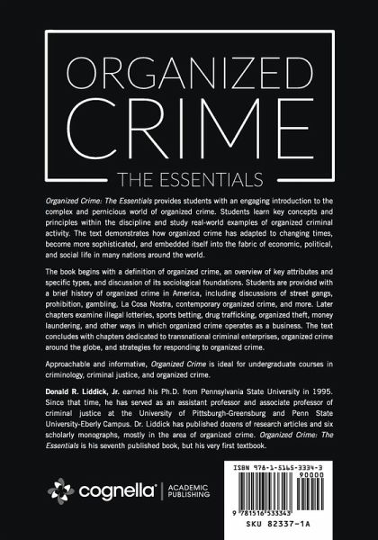 Organized Crime: The Essentials provides students with an engaging introduction to the complex and pernicious world of organized crime. Students learn key concepts and principles within the discipline and study real-world examples of organized criminal activity. The text demonstrates how organized crime has adapted to changing times, become more sophisticated, and embedded itself into the fabric of economic, political, and social life in many nations around the world. The book begins with a definition of organized crime, an overview of key attributes and specific types, and discussion of its sociological foundations. Students are provided with a brief history of organized crime in America, including discussions of street gangs, prohibition, gambling, La Cosa Nostra, contemporary organized crime, and more. Later chapters examine illegal lotteries, sports betting, drug trafficking, organized theft, money laundering, and other ways in which organized crime operates as a business. The text concludes with chapters dedicated to transnational criminal enterprises, organized crime around the globe, and strategies for responding to organized crime. Approachable and informative, Organized Crime is ideal for undergraduate courses in criminology, criminal justice, and organized crime. Donald R. Liddick, Jr. earned his Ph.D. from Pennsylvania State University in 1995. Since that time, he has served as an assistant professor and associate professor of criminal justice at the University of Pittsburgh-Greensburg and Penn State University-Eberly Campus. Dr. Liddick has published dozens of research articles and six scholarly monographs, mostly in the area of organized crime. Organized Crime: The Essentials is his seventh published book, but his very first textbook.