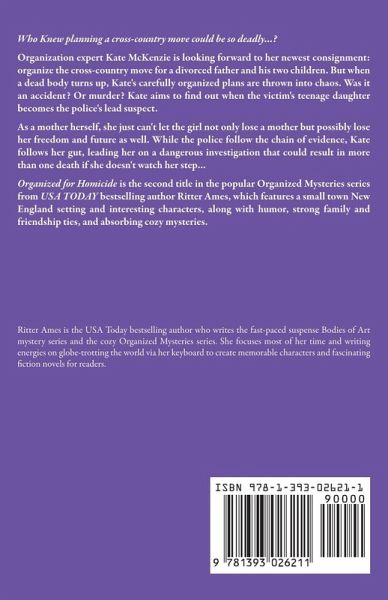 Packing up a client's home can be deadly business. Staying one step ahead of a killer is murder… The job sounded straightforward enough: organize the cross-country move for a divorced father and his children. Until a dead body turns up, and Kate's carefully organized plans are thrown into chaos. Was it an accident? Or murder? When the chain of evidence points police to someone she believes is innocent, Kate becomes emotionally involved. She must follow her gut to unpack the truth before it's too late. With the killer watching her too. All leading her into a dangerous investigation that could result in more than one death if she doesn't watch her step... WHAT PEOPLE ARE SAYING ABOUT ORGANIZED FOR HOMICIDE "Once again, Ritter Ames has crafted a story that pulls the reader right in. This well-plotted cozy mystery is the second in the delightful Organized Mysteries series. I found that I could not put this book down...Cozy mystery readers will love these characters and like me will want to read more of their adventures. So if you like your mystery well organized, then you should be reading Organized for Homicide." My Shelf Reviews "If you enjoy cozy type mysteries, I think you'll enjoy this light fast read." Murder Most Cozy Organized for Homicide is the second title in the popular Organized Mysteries series from USA TODAY bestselling author Ritter Ames, which features a small town New England setting and interesting characters, along with humor, strong family and friendship ties, and absorbing cozy mysteries.