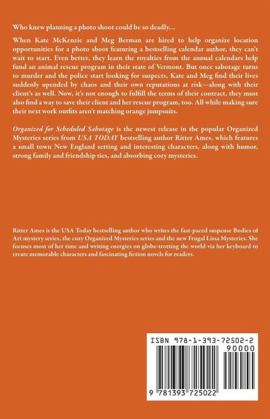 Who knew planning a calendar photo shoot could be so dangerous…? Kate and Meg contract to organize location opportunities for a photo shoot featuring a bestselling calendar author. Even better, they learn the royalties from the annual calendars help fund an animal rescue program in their state of Vermont. Until acts of sabotage start… Followed by murder. As the police look for suspects, Kate and Meg find their lives suddenly upended by chaos and their own reputations at risk-along with their client's. Now, it's not enough to fulfill the terms of their contract. They must also find a way to save their client and her rescue program, too. Can they accomplish all that and avoid finding their next work outfits are matching orange jumpsuits? Or worse...? WHAT PEOPLE ARE SAYING ABOUT ORGANIZED FOR SCHEDULED SABOTAGE "Another chance to solve an organized mystery with Kate and Meg? Yes, please!... Already looking forward to the next adventure!" Ellie's Reads "The plot was well-paced and the author added some great twists. I was surprised by the actual murderer. I enjoyed all the organizational tips that started each chapter." Escape with Dollycas into a Good Book Organized for Scheduled Sabotage is the third title in the popular Organized Mysteries series from USA TODAY bestselling author Ritter Ames, which features a small town New England setting and interesting characters, along with humor, strong family and friendship ties, and absorbing cozy mysteries.
