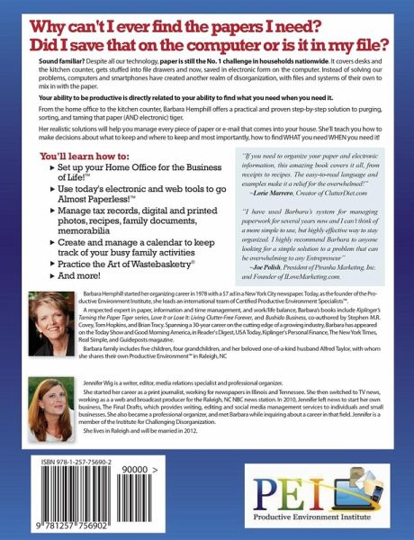 Why can't I ever find the papers I need? Did I save that on the computer or is it in my file? Sound familiar? Despite all our technology, paper is still the No. 1 challenge in households nationwide. It covers desks and the kitchen counter, gets stuffed into file drawers and now, saved in electronic form on the computer. Instead of solving our problems, computers and smartphones have created another realm of disorganization, with files and systems of their own to mix in with the paper. From the home office to the kitchen counter, Barbara Hemphill offers a step-by-step solution to purging, sorting and taming that paper (AND electronic) tiger. Her practical solutions will help you manage every piece of paper or e-mail that comes into your house. She'll teach you how to make decisions about what to keep and where to keep and most importantly, how to find WHAT you need WHEN you need it!