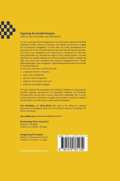 The book comprises the proceedings of the Working Conference on Organizing the Extended Enterprise, sponsored by the International Federation for Information Processing (IFIP), which was held in Ascona, Switzerland in September 1997. It will be of great importance to researchers, managers and consultants in production, logistics and information and other areas of organizational development.