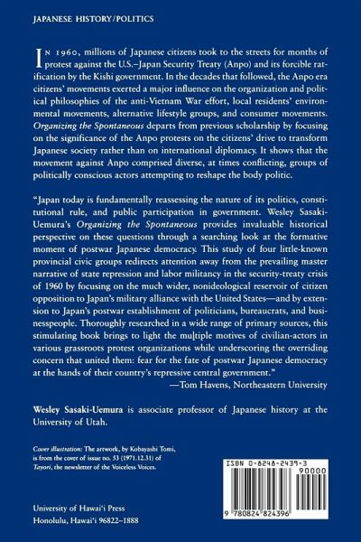 In 1960 millions of Japanese citizens took to the streets for months of protest against the US-Japan Security Treaty (Anpo) and its forcible ratification by the Kishi government. In the decades that followed, the Anpo era citizens' movements exerted a major influence on the organization and political philosophies of the anti-Vietnam War effort, local residents' environmental movements, alternative lifestyle groups, and consumer movements. ""Organizing the Spontaneous"" focuses on the significance of the Anpo protests on the citizens' drive to transform Japanese society rather than on international diplomacy. It shows that the movement against Anpo comprised diverse, at times conflicting, groups of politically conscious actors attempting to reshape the body politic.