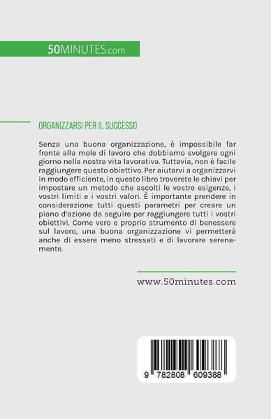 Senza una buona organizzazione, è impossibile far fronte alla mole di lavoro che dobbiamo svolgere ogni giorno nella nostra vita lavorativa. Tuttavia, non è facile raggiungere questo obiettivo. Per aiutarvi a organizzarvi in modo efficiente, in questo libro troverete le chiavi per impostare un metodo che ascolti le vostre esigenze, i vostri limiti e i vostri valori. È importante prendere in considerazione tutti questi parametri per creare un piano d'azione da seguire per raggiungere tutti i vostri obiettivi. Come vero e proprio strumento di benessere sul lavoro, una buona organizzazione vi permetterà anche di essere meno stressati e di lavorare serenamente.