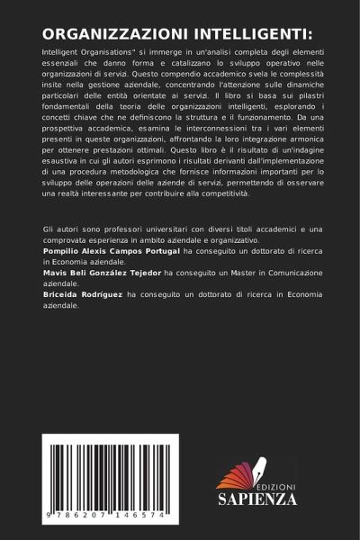 Intelligent Organisations" si immerge in un'analisi completa degli elementi essenziali che danno forma e catalizzano lo sviluppo operativo nelle organizzazioni di servizi. Questo compendio accademico svela le complessità insite nella gestione aziendale, concentrando l'attenzione sulle dinamiche particolari delle entità orientate ai servizi. Il libro si basa sui pilastri fondamentali della teoria delle organizzazioni intelligenti, esplorando i concetti chiave che ne definiscono la struttura e il funzionamento. Da una prospettiva accademica, esamina le interconnessioni tra i vari elementi presenti in queste organizzazioni, affrontando la loro integrazione armonica per ottenere prestazioni ottimali. Questo libro è il risultato di un'indagine esaustiva in cui gli autori esprimono i risultati derivanti dall'implementazione di una procedura metodologica che fornisce informazioni importanti per lo sviluppo delle operazioni delle aziende di servizi, permettendo di osservare una realtà interessante per contribuire alla competitività.