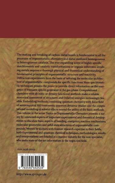The making and breaking of carbon-metal bonds is fundamental to all the processes of organometallic chemistry and metal mediated homogeneous or heterogeneous catalysis. The ever expanding scope of highly specific stoichiometric and catalytic transformations or organic substrates involving metals requires a thorough physical and theoretical understanding of fundamental principles of organometallic structure and reactivity. Diffraction experiments form the basis of tailoring the molecular architecture of organometallic compounds for specific functions. Mass spectrometric techniques possess the power to provide direct information on the energetics of transient species generated in the gas-phase. Computational chemistry with ab initio or density functional methods make a reliable numerical assessment of structures and (relative) energies increasingly feasible. Embedding methods, combining quantum chemistry with force field of semiempirical MO treatments, quantum dynamic studies and the computational modelling of solvent effects extend the utility of the basic methods. This volume in the series Topics in Organometallic Chemistry presents a survey by renowned experts of important experimental and theoretical developments to elucidate basic aspects of bonding, energetics, reaction mechanisms, molecular geometries and solid-state structures of organometallic compounds. Written by authors with frontier research expertise in their fields, both experimental and quantum chemical techniques, methodologies, results and interpretations are detailed in a manner suitable for the non-specialist, who seeks state-of-the-art information in the respective field.