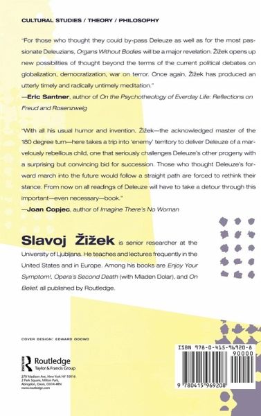 "For those who thought they could by-pass Deleuze as well for the most passionate Deleuzians, Organs Without Bodies will be a major revelation. By placing Deleuze into proximity with his great antipodes--Hegel and Lacan--Zizek endows Deleuze's tireless elaboration of the processes of differentiation and becoming in all spheres of life with an entirely new degree of conceptual clarity and political urgency. Through his deep engagement with the logic of Deleuze's project, Zizek opens up new possibilities of thought beyond the terms of the current political debates on globalization, democratization, war on terror. Once again, Zizek has produced an utterly timely and radically untimely meditation." -- Eric Santner, author of On the Psychotheology of Everday Life: Reflections on Freud and Rosenzweig