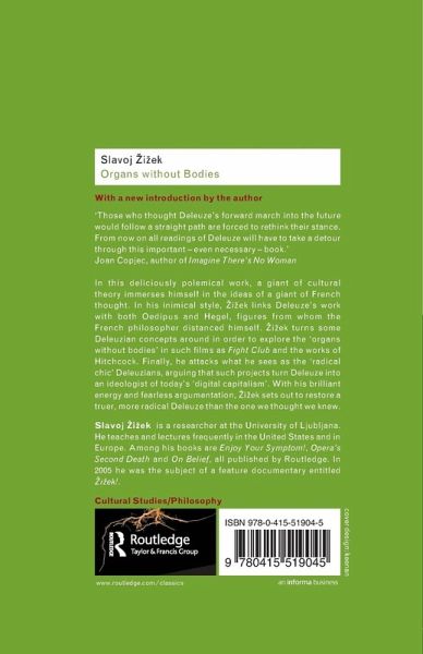 "For those who thought they could by-pass Deleuze as well for the most passionate Deleuzians, Organs Without Bodies will be a major revelation. By placing Deleuze into proximity with his great antipodes--Hegel and Lacan--Zizek endows Deleuze's tireless elaboration of the processes of differentiation and becoming in all spheres of life with an entirely new degree of conceptual clarity and political urgency. Through his deep engagement with the logic of Deleuze's project, Zizek opens up new possibilities of thought beyond the terms of the current political debates on globalization, democratization, war on terror. Once again, Zizek has produced an utterly timely and radically untimely meditation." -- Eric Santner, author of On the Psychotheology of Everday Life: Reflections on Freud and Rosenzweig