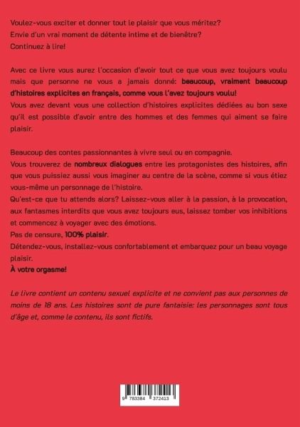 Voulez-vous exciter et donner tout le plaisir que vous méritez?Envie d'un vrai moment de détente intime et de bienêtre?Continuez à lire!Avec ce livre vous aurez l'occasion d'avoir tout ce que vous avez toujours voulu mais que personne ne vous a jamais donné: beaucoup, vraiment beaucoup d'histoires explicites en français, comme vous l'avez toujours voulu!Vous avez devant vous une collection d'histoires explicites dédiées au bon sexe qu'il est possible d'avoir entre des hommes et des femmes qui aiment se faire plaisir. Beaucoup des contes passionnantes à vivre seul ou en compagnie.Vous trouverez de nombreux dialogues entre les protagonistes des histoires, afin que vous puissiez aussi vous imaginer au centre de la scène, comme si vous étiez vous-même un personnage de l'histoire.Qu'est-ce que tu attends alors? Laissez-vous aller à la passion, à la provocation, aux fantasmes interdits que vous avez toujours eus, laissez tomber vos inhibitions et commencez à voyager avec des émotions.Pas de censure, 100 pour 100 de plaisir.Détendez-vous, installez-vous confortablement et embarquez pour un beau voyage plaisir.À votre orgasme!