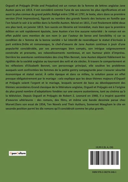 Orgueil et Préjugés (Pride and Prejudice) est un roman de la femme de lettres anglaise Jane Austen paru en 1813. Il est considéré comme l'une de ses oeuvres les plus significatives et est aussi la plus connue du grand public.Rédigé entre 1796 et 1797, le texte, alors dans sa première version (First Impressions), figurait au nombre des grands favoris des lectures en famille que l'on faisait le soir à la veillée dans la famille Austen. Révisé en 1811, il est finalement édité deux ans plus tard, en janvier 1813. Son succès en librairie est immédiat, mais bien que la première édition en soit rapidement épuisée, Jane Austen n'en tire aucune notoriété : le roman est en effet publié sans mention de son nom (« par l'auteur de Sense and Sensibility ») car sa condition de « femme de la bonne société » lui interdit de revendiquer le statut d'écrivain à part entière.Drôle et romanesque, le chef-d'oeuvre de Jane Austen continue à jouir d'une popularité considérable, par ses personnages bien campés, son intrigue soigneusement construite et prenante, ses rebondissements nombreux, et son humour plein d'imprévu. Derrière les aventures sentimentales des cinq filles Bennet, Jane Austen dépeint fidèlement les rigidités de la société anglaise au tournant des xviii et xix siècles. À travers le comportement et les réflexions d'Elizabeth Bennet, son personnage principal, elle soulève les problèmes auxquels sont confrontées les femmes de la petite gentry campagnarde pour s'assurer sécurité économique et statut social. À cette époque et dans ce milieu, la solution passe en effet presque obligatoirement par le mariage : cela explique que les deux thèmes majeurs d'Orgueil et Préjugés soient l'argent et le mariage, lesquels servent de base au développement des thèmes secondaires.Grand classique de la littérature anglaise, Orgueil et Préjugés est à l'origine du plus grand nombre d'adaptations fondées sur une oeuvre austenienne, tant au cinéma qu'à la télévision. Depuis Orgueil et Préjugés de Robert Z. Leonard en 1940, il a inspiré quantité d'oeuvres ultérieures : des romans, des films, et même une bande dessinée parue chez Marvel.Dans son essai de 1954, Ten Novels and Their Authors, Somerset Maugham le cite en seconde position parmi les dix romans qu'il considérait comme les plus grands.