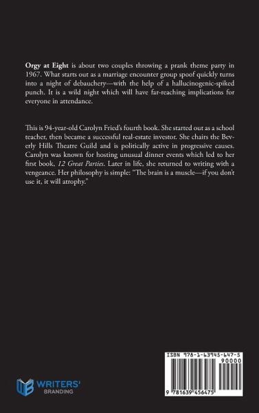 Book synopsis:Orgy at Eight is about two couples throwing a prank theme party in 1967. What starts out as a marriage encounter group spoof quickly turns into a night of debauchery-with the help of a hallucinogenic-spiked punch. It is a wild night which will have far-reaching implications for everyone in attendance. Autobiography: This is 94-year-old Carolyn Fried's fourth book. She started out as a school teacher, then became a successful real-estate investor. She chairs the Beverly Hills Theatre Guild and is politically active in progressive causes. Carolyn was known for hosting unusual dinner events which led to her first book, 12 Great Parties. Later in life, she returned to writing with a vengeance. Her philosophy is simple: "The brain is a muscle-if you don't use it, it will atrophy."