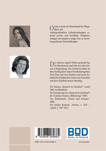Die Autorin, Ingrid Walter, genannt Ina, ist Münchnerin und lebt seit zehn Jahren in Regensburg. Als Erzieherin leitete sie über dreißig Jahre einen Privatkindergarten. Zwei Ehen mit zwei Kindern und sechs Enkelkindern hielten ihre Liebe zum Schreiben seit ihrer Kindheit immer lebendig. Der Roman ¿Konzert in Lissabon?¿ wurde 2001 veröffentlicht. Die Fortsetzung von ¿Konzert in Lissabon?¿, der Familien-Roman ¿Höhenwege¿ 2003. Das Kinderbuch: ¿Konni und Schnauz.¿ 2008. Die beiden Romane: ¿Oriane, 1. Teil¿ ¿ ¿Jakob, 2. Teil¿ 2013