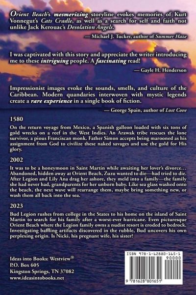 1580: On the return voyage from Mexico, a Spanish galleon loaded with six tons of gold wrecks on a reef in the West Indies. An Arawak tribe rescues the lone survivor, a pious Franciscan monk. Father Simon accepts being marooned as his assignment from God to civilize these naked savages and use the gold for the His glory. 2002: It was to be a honeymoon in Saint Martin while awaiting her lover’s divorce… Abandoned, hidden away at Orient Beach, Zuzu wanted to die—had tried to die. After Legion and Lily Ana drag her ashore, they meld into a family—the family she had never had, grandparents for her unborn baby. Like sea glass washed onto the beach, the next wave will rearrange them, maybe bring something new, or wash them all back into the sea. 2023: Bud Legion rushes from college in the States to his home on the island of Saint Martin to search for his family after a worst-ever hurricane. Even picturesque Orient Beach where the Legion family owns a nudist resort is eroded to bedrock. Investigating baffling artifacts discovered in the rubble, Bud uncovers his own perplexing origin. Is Nicki, his pregnant wife, also his sister?