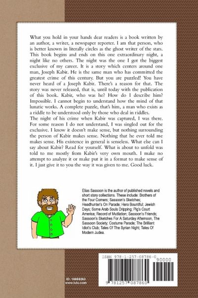 What you hold readers is a book written by a newspaper reporter. I am that person, better known in literally circles as the ghost writer of the stars. It begins and ends on one extraordinary night, the night I got the biggest exclusive of my career. The story centers on one man, Joseph Kabir, the man who has committed the greatest crime of this century. Puzzled! Never heard of a Joseph Kabir? The story was never released until today with this publication. Kabir, who was he? Describe him? Impossible. I cannot understand the mind of that lunatic. A puzzle who exists as a riddle. The night of his crime when Kabir was captured, I was singled out for the exclusive. Doesn't make sense, but nothing surrounding Kabir makes sense. Nothing he ever told me makes sense. His existence is senseless. What else can I say. Read for yourself. What was told to me comes from Kabir's own mouth. There's no attempt to analyze or make sense of it. I give it to you the way it was given to me. Good luck.