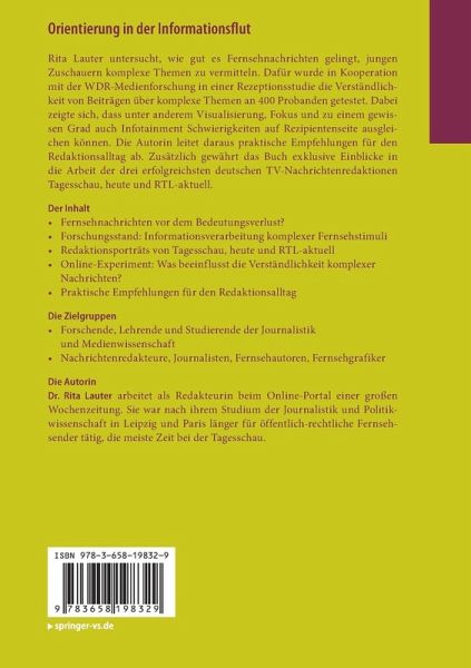 Rita Lauter untersucht, wie gut es Fernsehnachrichten gelingt, jungen Zuschauern komplexe Themen zu vermitteln. Dafür wurde in Kooperation mit der WDR-Medienforschung in einer Rezeptionsstudie die Verständlichkeit von Beiträgen über komplexe Themen an 400 Probanden getestet. Dabei zeigte sich, dass unter anderem Visualisierung, Fokus und zu einem gewissen Grad auch Infotainment Schwierigkeiten auf Rezipientenseite ausgleichen können. Die Autorin leitet daraus praktische Empfehlungen für den Redaktionsalltag ab. Zusätzlich gewährt das Buch exklusive Einblicke in die Arbeit der drei erfolgreichsten deutschen TV-Nachrichtenredaktionen Tagesschau, heute und RTL-aktuell.