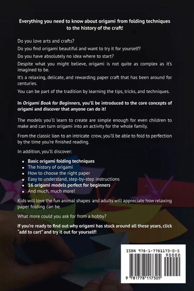 The ancient art of origami originated in Japan, where it is steeped in traditional values. The models presented in this series include many with strong symbolic meanings, such as the carp, the frog, and the crane, which symbolize longevity, good luck, and perseverance. There's a more playful side to origami as well: the stylized paper sumo wrestler with realistic moves has entertained Japanese children for centuries, and the paper samurai hat is a favorite of kids. This new version includes 16 origami models totally different from previous versions! In addition, you'll discover:Classic and contemporary Models¿Try your hand at recognizable models like lion and sparrow, as well as original designs like mouse and camel. Tips and techniques¿Pay attention to tips that help you select the right paper, work through tough steps, and add your own creative twist. Symbol glossary¿Find a comprehensive guide to standard origami symbols, as well as helpful info on how to read origami diagrams. And much, much more! Origami is an ideal activity for children since paper folding develops dexterity and creativity. Origami is also a craft based on a few fundamental 3D folding techniques. This book is a useful starting point for fans of all ages and abilities. Although this book is aimed at origami beginners, it contains projects suitable for origami fans of all ages and abilities and is the perfect book for all those who enjoy making things with their hands!