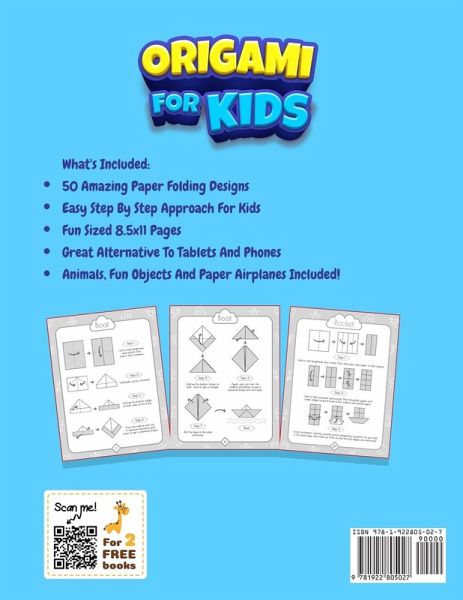 Are you looking for a calming and entertaining activity for your child? Do you want your child to develop a hobby that is educational and entertaining? If so, then Origami for Kids is the perfect book for you! Learning the art of origami, or paper folding has many benefits for young minds. This ancient art form encourages creativity, develops patience, and promotes a sense of achievement. With minimal supplies needed-only one or two pieces of paper-it's a great hobby to practice anywhere! With simple-to-follow instructions, your child can begin with a boat or rabbit and advance to the more complex seahorse, lotus flower, or elephant design. When you see the amazing creations from a simple piece of paper, you may want to join the fun yourself! Features Include: 50 origami designs No previous experience necessary A great alternative to tablets and phones Minimum supplies required Great for learners of all ages If your child is ready to learn this beautiful art form, select 'Add To Cart' and purchase Origami for Kids!