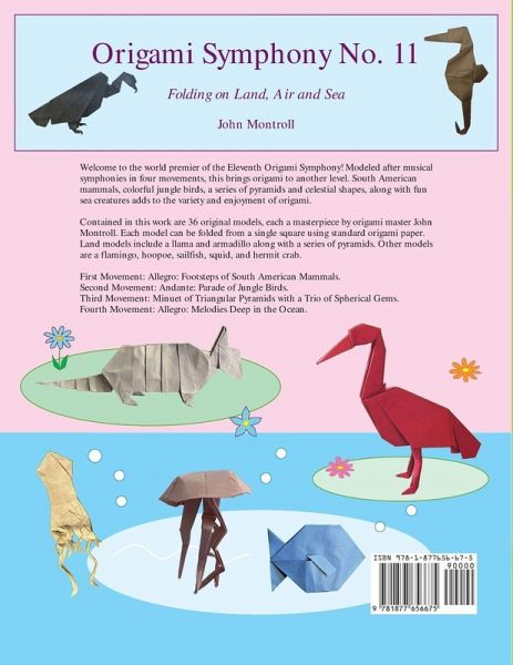 Welcome to the world premier of the Eleventh Origami Symphony! Modeled after musical symphonies in four movements, this brings origami to another level. South American mammals, colorful jungle birds, a series of pyramids and celestial shapes, along with fun sea creatures adds to the variety and enjoyment of origami. Contained in this work are 36 original models, each a masterpiece by origami master John Montroll. Each model can be folded from a single square using standard origami paper. Land models include a llama and armadillo along with a series of pyramids. Other models are a flamingo, hoopoe, sailfish, squid, and hermit crab. First Movement: Allegro: Footsteps of South American Mammals. Second Movement: Andante: Parade of Jungle Birds. Third Movement: Minuet of Triangular Pyramids with a Trio of Spherical Gems. Fourth Movement: Allegro: Melodies Deep in the Ocean.