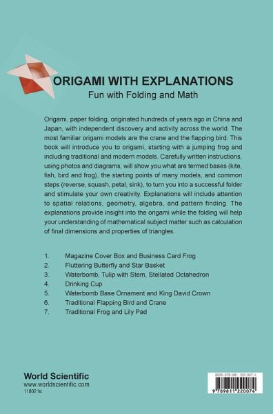Origami, paper folding, originated hundreds of years ago in China and Japan, with independent discovery and activity across the world. The most familiar origami models are the crane and the flapping bird. This book will introduce you to origami, starting with a jumping frog and including traditional and modern models. Carefully written instructions, using photos and diagrams, will show you the main origami bases, turn you into a successful folder and stimulate your own creativity. Explanations will include attention to spatial relations, geometry, algebra, and pattern finding. The explanations provide insight into the origami while the folding will help your understanding of mathematics.Magazine Cover Box and Business Card Frog Fluttering Butterfly and Star Basket Waterbomb, Tulip with Stem, Stellated Octahedron Drinking Cup Waterbomb Base Ornament and King David Crown Traditional Flapping Bird and Crane Traditional Frog and Lily Pad