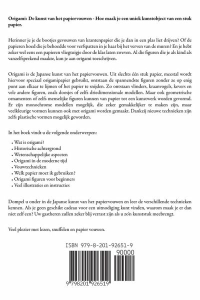Origami: De kunst van het papiervouwen - Hoe maak je een uniek kunstobject van een stuk papier. Herinner je je de bootjes gevouwen van krantenpapier die je dan in een plas liet drijven? Of de papieren hoed die je behoedde voor verfspatten in je haar bij het verven van de muren? En je hebt zeker wel eens een papieren vliegtuigje door de klas laten zweven. Al die figuren die je als kind als vanzelfsprekend maakte, kun je aan origami toeschrijven. Origami is de Japanse kunst van het papiervouwen. Uit slechts één stuk papier, meestal wordt hiervoor speciaal origamipapier gebruikt, ontstaan de spannendste figuren zonder ze op enig punt aan elkaar te lijmen of het papier te snijden. Zo ontstaan vlinders, kraanvogels, kevers en vele andere figuren, zoals doosjes of zelfs driedimensionale modellen. Maar ook geometrische ornamenten of zelfs menselijke figuren kunnen van papier tot een kunstwerk worden gevormd. Er zijn monochrome modellen mogelijk, die zeker gemakkelijker te maken zijn, maar veelkleurige vormen kunnen ook met origami worden gemaakt. Dankzij nieuwe technieken zijn zelfs plastische vormen mogelijk geworden. In het boek vindt u de volgende onderwerpen:Wat is origami? Historische achtergrond Wetenschappelijke aspecten Origami in de moderne tijd Vouwtechnieken Welk papier moet ik gebruiken? Origami figuren voor beginners Veel illustraties en instructies Dompel u onder in de Japanse kunst van het papiervouwen en leer de verschillende technieken kennen. Als je geen geschikt cadeau voor een uitnodiging kunt vinden, waarom maak je er dan niet zelf een? Uw gastheren zullen zeker blij verrast zijn als u zo'n kunststuk meebrengt. Veel plezier met lezen, snuffelen en papier vouwen.