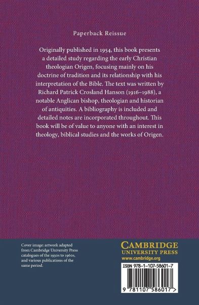 Originally published in 1954, this book presents a detailed study regarding the early Christian theologian Origen, focusing mainly on his doctrine of tradition and its relationship with his interpretation of the Bible. The text was written by Richard Patrick Crosland Hanson (1916-88), a notable Anglican bishop, theologian and historian of antiquities. A bibliography is included and detailed notes are incorporated throughout. This book will be of value to anyone with an interest in theology, biblical studies and the works of Origen.