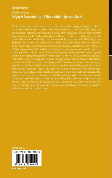 Chapter 1. Introduction.- Chapter 2. Mineralogy.- Chapter 3. Classification.- Chapter 4. Different Localities of Potassium-Rich Silica-Undersaturated Igneous Rocks and their Silica-Rich Variants.- Chapter 5. Minor and Rare Earth Element Geochemistry of K-Rich Silica- Chapter 6. Undersaturated Igneous Rocks.- Chapter 7. Chemical and Physical Constraints for Crystallization of Feldspathoids and Melilite in Potassium-Rich Rocks.- Chapter 8. Ternary Systems with Feldspathoids.- Chapter 9. Incompatible Mineral Pairs in K-Rich Rocks.- Chapter 9. Leucite- and Feldspar-Bearing Systems.- Chapter 10. Melilite- and Leucite-Bearing Systems.- Chapter 11. Phase Relations in the System Leucite-Akermanite-Albite-SiO2.- Chapter 12. P-T Stability of Phlogopite, K-Richterite and Phengite, as a Source of Potassium in the Mantle.- Chapter 13. Experimental Studies on K-Rich Rocks.- Chapter 14. Structural and Tectonic Evolution of K-Rich Silica-Deficient Volcanic Provinces of Different Continents.- Chapter 15. Genesis of Ultrapotassic Rocks.- Chapter 16. Petrologic Conclusions.- References.