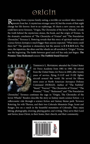 Returning from a joyous family outing, a terrible car accident takes Amme's parents from her. A mysterious stranger saves M, but the events of that night change her life forever. Sent to an orphanage, M charts a new course; one she could have never foreseen. "Origin, The Chronicles of the Seven Wheels," reveals the truth behind the mysterious stones, the book, and the origin of Trinian. In the dramatic conclusion of "The Chronicles of Trinian" and "The Foundation Chronicles," Terrence L. Rotering reveals that this story of spiritual warfare and science fiction dystopia is much bigger than anyone expected. "What more could there be?" The question is elementary, but the answer is E-T-E-R-N-A-L. The stars, the tapestries, the altars and the wheels are all unveiled in "Origin." Trinian was the beginning. The battle between good and evil has only just begun. The Promise Time Redeemed ensures The Faithful Stand Forever! Terrence L. Rotering attended the United States Air Force Academy from 1981 to 1985. He retired from the United States Air Force in 2005, after twenty years of service, flying F-111F and F-15E fighter aircraft around the world. He served for fifteen more years at North American Aerospace Defense Command (NORAD). Author of "The Faithful," "Stand," "Forever," "The Chronicles of Trinian," "The Promise," "Time," "Redeemed," and "The Foundation Chronicles," Terrence continues the saga in "Origin, The Chronicles of the Seven Wheels." Readers describe the story as fantasy meets science fiction - a rollercoaster ride through a science fiction and fantasy theme park. Terrence Rotering, his wife Theresa, and their two Colorado Mountain Dogs, Scout and Ranger, live on a ranch in the beautiful mountains of Colorado. They enjoy hiking, photography, drawing, playing guitar, and writing. They serve their Lord and Savior, Jesus Christ, in their home, their church, and their community.