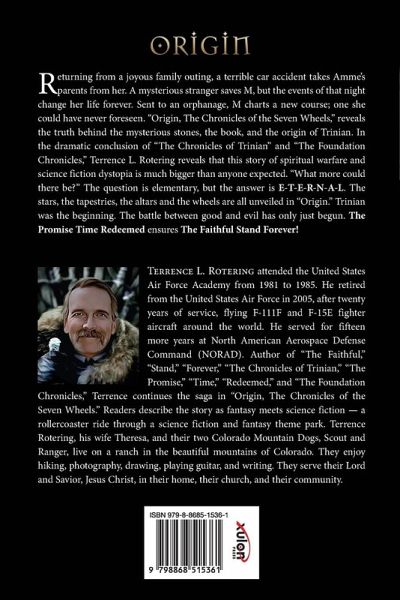Returning from a joyous family outing, a terrible car accident takes Amme's parents from her. A mysterious stranger saves M, but the events of that night change her life forever. Sent to an orphanage, M charts a new course; one she could have never foreseen. "Origin, The Chronicles of the Seven Wheels," reveals the truth behind the mysterious stones, the book, and the origin of Trinian. In the dramatic conclusion of "The Chronicles of Trinian" and "The Foundation Chronicles," Terrence L. Rotering reveals that this story of spiritual warfare and science fiction dystopia is much bigger than anyone expected. "What more could there be?" The question is elementary, but the answer is E-T-E-R-N-A-L. The stars, the tapestries, the altars and the wheels are all unveiled in "Origin." Trinian was the beginning. The battle between good and evil has only just begun. The Promise Time Redeemed ensures The Faithful Stand Forever! Terrence L. Rotering attended the United States Air Force Academy from 1981 to 1985. He retired from the United States Air Force in 2005, after twenty years of service, flying F-111F and F-15E fighter aircraft around the world. He served for fifteen more years at North American Aerospace Defense Command (NORAD). Author of "The Faithful," "Stand," "Forever," "The Chronicles of Trinian," "The Promise," "Time," "Redeemed," and "The Foundation Chronicles," Terrence continues the saga in "Origin, The Chronicles of the Seven Wheels." Readers describe the story as fantasy meets science fiction - a rollercoaster ride through a science fiction and fantasy theme park. Terrence Rotering, his wife Theresa, and their two Colorado Mountain Dogs, Scout and Ranger, live on a ranch in the beautiful mountains of Colorado. They enjoy hiking, photography, drawing, playing guitar, and writing. They serve their Lord and Savior, Jesus Christ, in their home, their church, and their community.