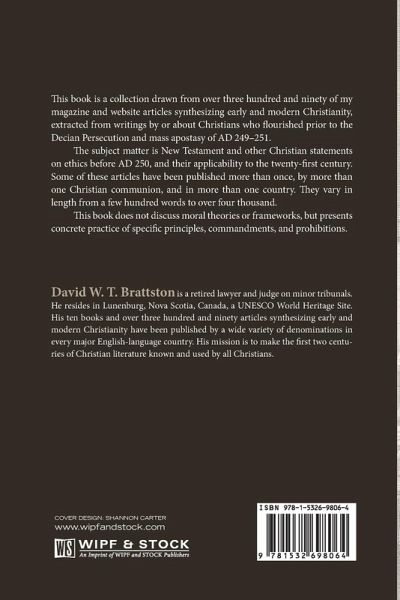 This book is a collection drawn from over three hundred and ninety of my magazine and website articles synthesizing early and modern Christianity, extracted from writings by or about Christians who flourished prior to the Decian Persecution and mass apostasy of AD 249-251. The subject matter is New Testament and other Christian statements on ethics before AD 250, and their applicability to the twenty-first century. Some of these articles have been published more than once, by more than one Christian communion, and in more than one country. They vary in length from a few hundred words to over four thousand. This book does not discuss moral theories or frameworks, but presents concrete practice of specific principles, commandments, and prohibitions.