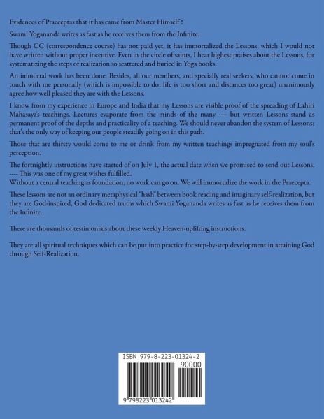 Evidences of Praeceptas that it has came from Master Himself ! Swami Yogananda writes as fast as he receives them from the Infinite. Though CC (correspondence course) has not paid yet, it has immortalized the Lessons, which I would not have written without proper incentive. Even in the circle of saints, I hear highest praises about the Lessons, for systematizing the steps of realization so scattered and buried in Yoga books. An immortal work has been done. Besides, all our members, and specially real seekers, who cannot come in touch with me personally (which is impossible to do; life is too short and distances too great) unanimously agree how well pleased they are with the Lessons. I know from my experience in Europe and India that my Lessons are visible proof of the spreading of Lahiri Mahasaya's teachings. Lectures evaporate from the minds of the many --- but written Lessons stand as permanent proof of the depths and practicality of a teaching. We should never abandon the system of Lessons; that's the only way of keeping our people steadily going on in this path. Those that are thirsty would come to me or drink from my written teachings impregnated from my soul's perception. The fortnightly instructions have started of on July 1, the actual date when we promised to send out Lessons. ---- This was one of my great wishes fulfilled. Without a central teaching as foundation, no work can go on. We will immortalize the work in the Praecepta. These lessons are not an ordinary metaphysical "hash" between book reading and imaginary self-realization, but they are God-inspired, God dedicated truths which Swami Yogananda writes as fast as he receives them from the Infinite. There are thousands of testimonials about these weekly Heaven-uplifting instructions. They are all spiritual techniques which can be put into practice for step-by-step development in attaining God through Self-Realization.