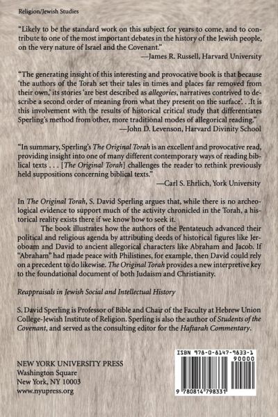 Is the Torah true? Do the five books of Moses provide an accurate historical account of the people of ancient Israel's origins? In The Original Torah, S. David Sperling argues that, while there is no archeological evidence to support much of the activity chronicled in the Torah, a historical reality exists there if we know how to seek it. By noting the use of foreign words or mentions of technological innovations scholars can often pinpoint the date and place in which a text was written. Sperling examines the stories of the Torah against their historical and geographic backgrounds and arrives at a new conclusion: the tales of the Torah were originally composed as allegories whose purpose was distinctly and intentionally political. The book illustrates how the authors of the Pentateuch advanced their political and religious agenda by attributing deeds of historical figures like Jeroboam and David to ancient allegorical characters like Abraham and Jacob. If "Abraham" had made peace with Philistines, for example, then David could rely on a precedent to do likewise. The Original Torah provides a new interpretive key to the foundational document of both Judaism and Christianity.