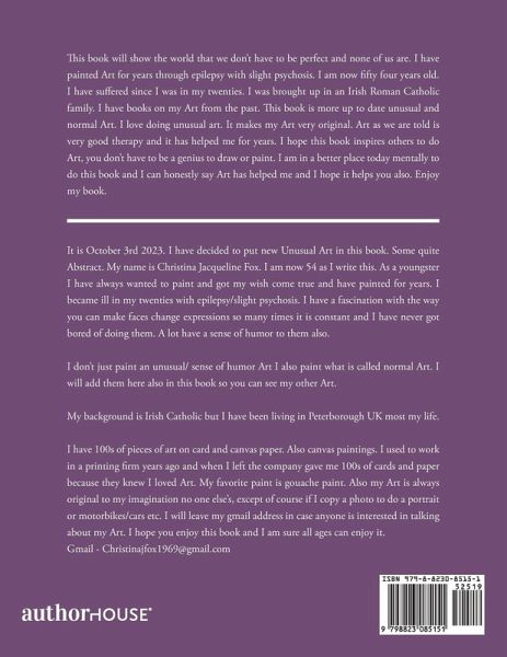 This book will show the world that we don't have to be perfect and none of us are. I have painted Art for years through epilepsy with slight psychosis. I am now fifty four years old. I have suffered since I was in my twenties. I was brought up in an Irish Roman Catholic family. I have books on my Art from the past. This book is more up to date unusual and normal Art. I love doing unusual art. It makes my Art very original. Art as we are told is very good therapy and it has helped me for years. I hope this book inspires others to do Art, you don't have to be a genius to draw or paint. I am in a better place today mentally to do this book and I can honestly say Art has helped me and I hope it helps you also. Enjoy my book.