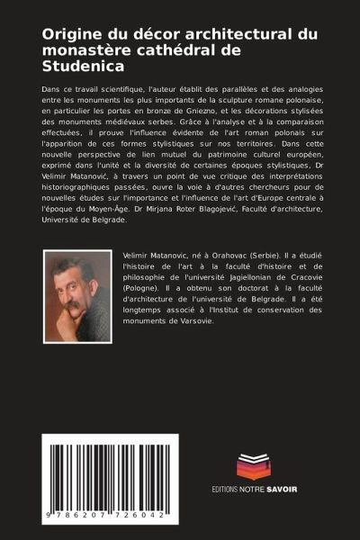 Dans ce travail scientifique, l'auteur établit des parallèles et des analogies entre les monuments les plus importants de la sculpture romane polonaise, en particulier les portes en bronze de Gniezno, et les décorations stylisées des monuments médiévaux serbes. Grâce à l'analyse et à la comparaison effectuées, il prouve l'influence évidente de l'art roman polonais sur l'apparition de ces formes stylistiques sur nos territoires. Dans cette nouvelle perspective de lien mutuel du patrimoine culturel européen, exprimé dans l'unité et la diversité de certaines époques stylistiques, Dr Velimir Matanovic, à travers un point de vue critique des interprétations historiographiques passées, ouvre la voie à d'autres chercheurs pour de nouvelles études sur l'importance et l'influence de l'art d'Europe centrale à l'époque du Moyen-Âge. Dr Mirjana Roter Blagojevic, Faculté d'architecture, Université de Belgrade.