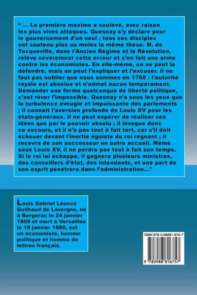 " ... La première maxime a soulevé, avec raison les plus vives attaques. Quesnay s'y déclare pour le gouvernement d'un seul ; tous ses disciples ont soutenu plus ou moins la même thèse. M. de Tocqueville, dans l'Ancien Régime et la Révolution, relève sévèrement cette erreur et s'en fait une arme contre les économistes. En elle-même, on ne peut la défendre, mais on peut l'expliquer et l'excuser. Il ne faut pas oublier que nous sommes en 1760 : l'autorité royale est absolue et n'admet aucun tempérament. Demander une forme quelconque de liberté politique, c'est rêver l'impossible. Quesnay n'a sous les yeux que la turbulence aveugle et impuissante des parlements ; il connaît l'aversion profonde de Louis XV pour les états-généraux. Il ne peut espérer de réaliser ses idées que par le pouvoir absolu ; il invoque donc ce secours, et il n'a pas tout à fait tort, car s'il doit échouer devant l'inertie égoïste du roi régnant ; il recevra de son successeur un autre accueil. Même sous Louis XV, il ne perdra pas tout à fait son temps. Si le roi lui échappe, il gagnera plusieurs ministres, des conseillers d'état, des intendants, et une part de son esprit pénétrera dans l'administration..."