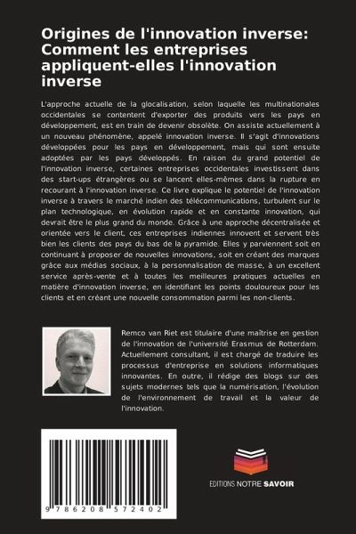 L'approche actuelle de la glocalisation, selon laquelle les multinationales occidentales se contentent d'exporter des produits vers les pays en développement, est en train de devenir obsolète. On assiste actuellement à un nouveau phénomène, appelé innovation inverse. Il s'agit d'innovations développées pour les pays en développement, mais qui sont ensuite adoptées par les pays développés. En raison du grand potentiel de l'innovation inverse, certaines entreprises occidentales investissent dans des start-ups étrangères ou se lancent elles-mêmes dans la rupture en recourant à l'innovation inverse. Ce livre explique le potentiel de l'innovation inverse à travers le marché indien des télécommunications, turbulent sur le plan technologique, en évolution rapide et en constante innovation, qui devrait être le plus grand du monde. Grâce à une approche décentralisée et orientée vers le client, ces entreprises indiennes innovent et servent très bien les clients des pays du bas de la pyramide. Elles y parviennent soit en continuant à proposer de nouvelles innovations, soit en créant des marques grâce aux médias sociaux, à la personnalisation de masse, à un excellent service après-vente et à toutes les meilleures pratiques actuelles en matière d'innovation inverse, en identifiant les points douloureux pour les clients et en créant une nouvelle consommation parmi les non-clients.