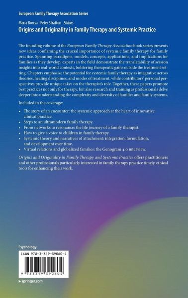 From Origins and Originality - Family Therapy and the European Idea.- From Pragmatics to Complexity: Developments and Perspectives of Systemic Psychotherapy.- The Story of an Encounter: The Systemic Approach at the Heart of Innovative Clinical Practice.- Time: An A-theoretical Framework for Therapy and Healing.- Steps to an Ultramodern Family Therapy.- From Networks to Resonance - The Life Journey of a Family Therapist.- Families, Therapists and Nodal Thirds.- Fascinating Interfaces and Systems: Integrating Biology, Psychology and Social Sciences in Teaching, Therapy and Coaching.- Systemic Theory and Narratives of Attachment: Integration, Formulation and Development Over Time.- How to Give a Voice to Children in Family Therapy. Blind and Mute Family Sculpting in the Training of Family Therapists.- A Multi-level, Multi-focal, Multi-voiced Journey: Not Without Family Therapy - NotWith Family Therapy Alone.- Virtual Relations and Globalized Families - The Genogram 4.0 Interview.- Innovations in Family Therapy and Systemic Practice.-
