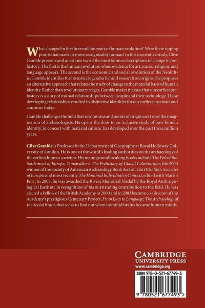 In this innovative study Clive Gamble presents and questions two of the most famous descriptions of change in prehistory. The first is the 'human revolution', when evidence for art, music, religion and language first appears. The second is the economic and social revolution of the Neolithic period. Gamble identifies the historical agendas behind 'origins research' and presents a bold new alternative to these established frameworks, relating the study of change to the material basis of human identity. He examines, through artefact proxies, how changing identities can be understood using embodied material metaphors and in two major case-studies charts the prehistory of innovations, asking, did agriculture really change the social world? This is an important and challenging book that will be essential reading for every student and scholar of prehistory.