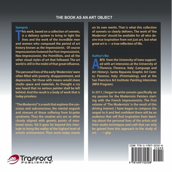 This work, based on a collection of sonnets, is a delivery system to bring to light the lives and the work of the incredible men and women who composed the period of art history known as the Impressionist. Of course Impressionism fostered the post Impressionist, Neo-Impressionist, the Pointillists, and all the other visual styles of art that followed. The art world is still in the midst of that great influence. The personal lives of the early 'Modernists' were often filled with poverty, disappointment, and depression. Yet those with means would share studio space and materials. As thought a cry was heard that no serious painter shall be left behind. And the result is a body of work that is today priceless. "The Modernist" is a work that explores the conscious and subconscious; the mental anguish and stresses of those suffering from bi-polar syndrome. Thus the creative arts are so often closely aligned with genetic points of emotional stress. Yet it goes far beyond this interlude to bring the reality of the highest level of artistic achievement. Their work today stands on its own merits. That is what this collection of sonnets so clearly delivers. The work of 'the Modernist' should be available for all who desire true inspiration from not just art, but what great art is - a true reflection of life.