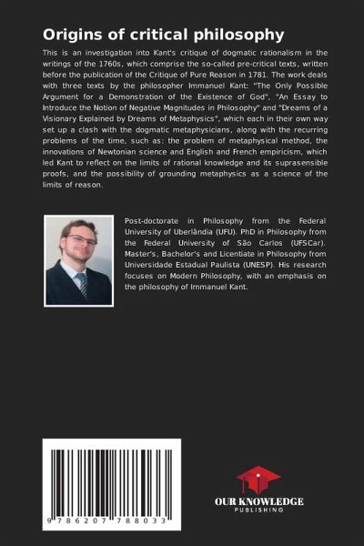 This is an investigation into Kant's critique of dogmatic rationalism in the writings of the 1760s, which comprise the so-called pre-critical texts, written before the publication of the Critique of Pure Reason in 1781. The work deals with three texts by the philosopher Immanuel Kant: "The Only Possible Argument for a Demonstration of the Existence of God", "An Essay to Introduce the Notion of Negative Magnitudes in Philosophy" and "Dreams of a Visionary Explained by Dreams of Metaphysics", which each in their own way set up a clash with the dogmatic metaphysicians, along with the recurring problems of the time, such as: the problem of metaphysical method, the innovations of Newtonian science and English and French empiricism, which led Kant to reflect on the limits of rational knowledge and its suprasensible proofs, and the possibility of grounding metaphysics as a science of the limits of reason.